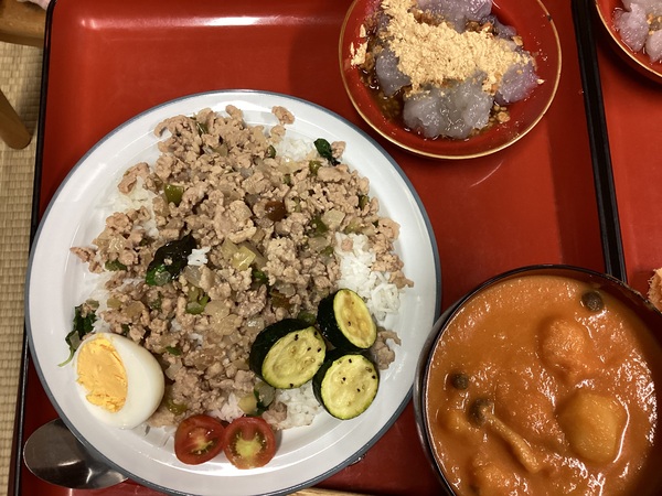 | ガパオライス | うるち米(富山) バスマティライス 豚肉(国産) 玉ねぎ(南砺) ピーマン(吉田さん) パプリカ(柏樹さん) バジル(柏樹さん) オイスターソース ナンプラー きび砂糖 にんにく(砺波) 米油 たまご(高岡) ミニトマト(柏樹さん) ズッキーニ(吉田さん) 塩 こしょう 有機オリーブ油 |